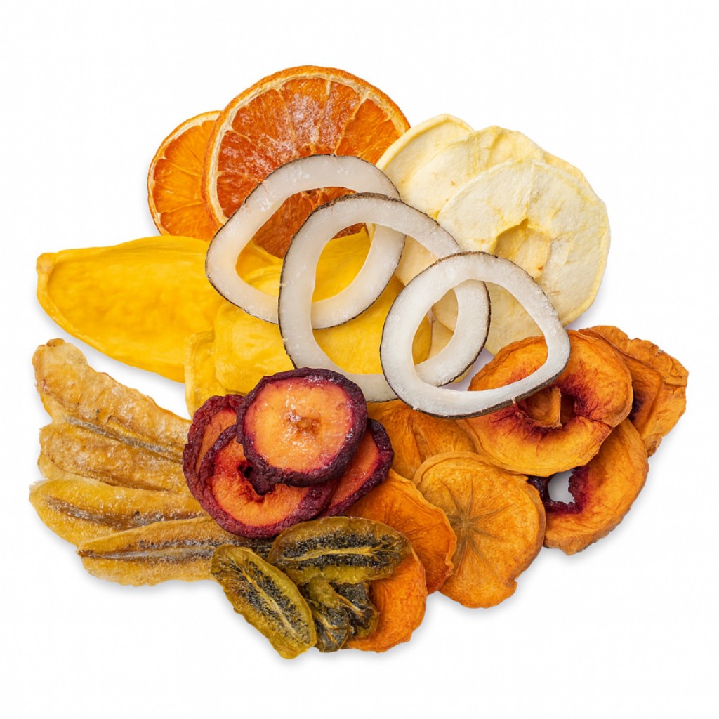 اسلایس میوههای خشک شامل موز، پرتقال، انبه، سیب، کیوی، نارگیل، هلو و آلو. بدون افزودنی، بدون شکر اضافه، با حفظ رنگ، بافت و خواص اصلی هر میوه. مناسب برای میانوعده، پذیرایی یا ترکیب با صبحانه های سالم.