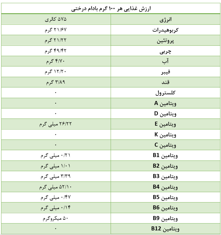 جدول ارزش غذایی بادام درختی